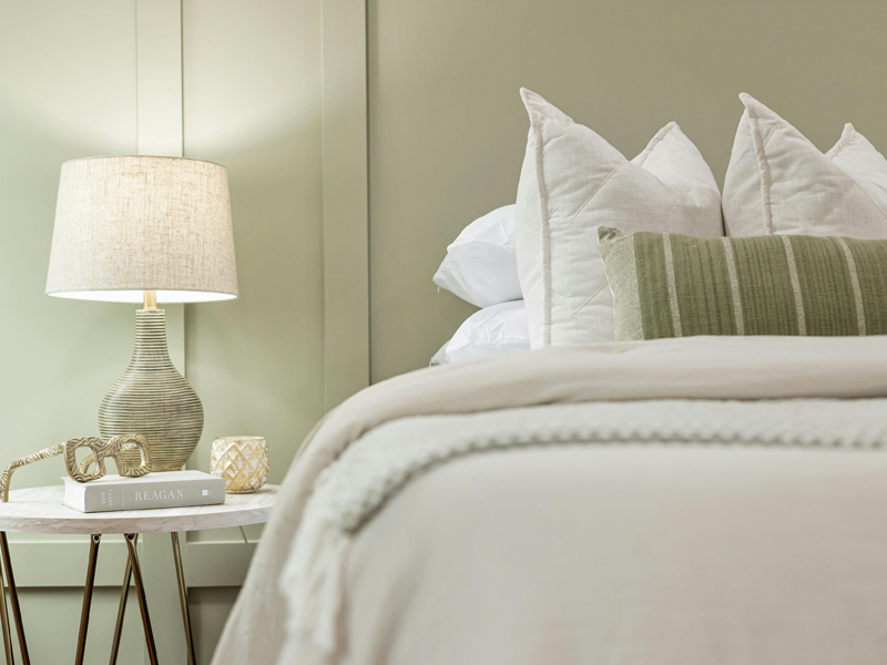 For the bedroom, soft whites and cool taupes create a restful retreat. We like to include layered bedding and linen in varying textures to introduce subtle contrast. This contrasted by wooden furniture pieces like a bedside table or a headboard creates balance and warmth. Using serene wall art in muted tones creates a relaxed atmosphere that makes the bedroom feel like peaceful space.